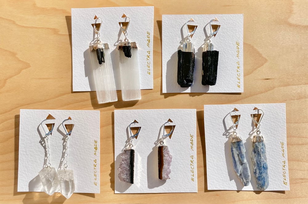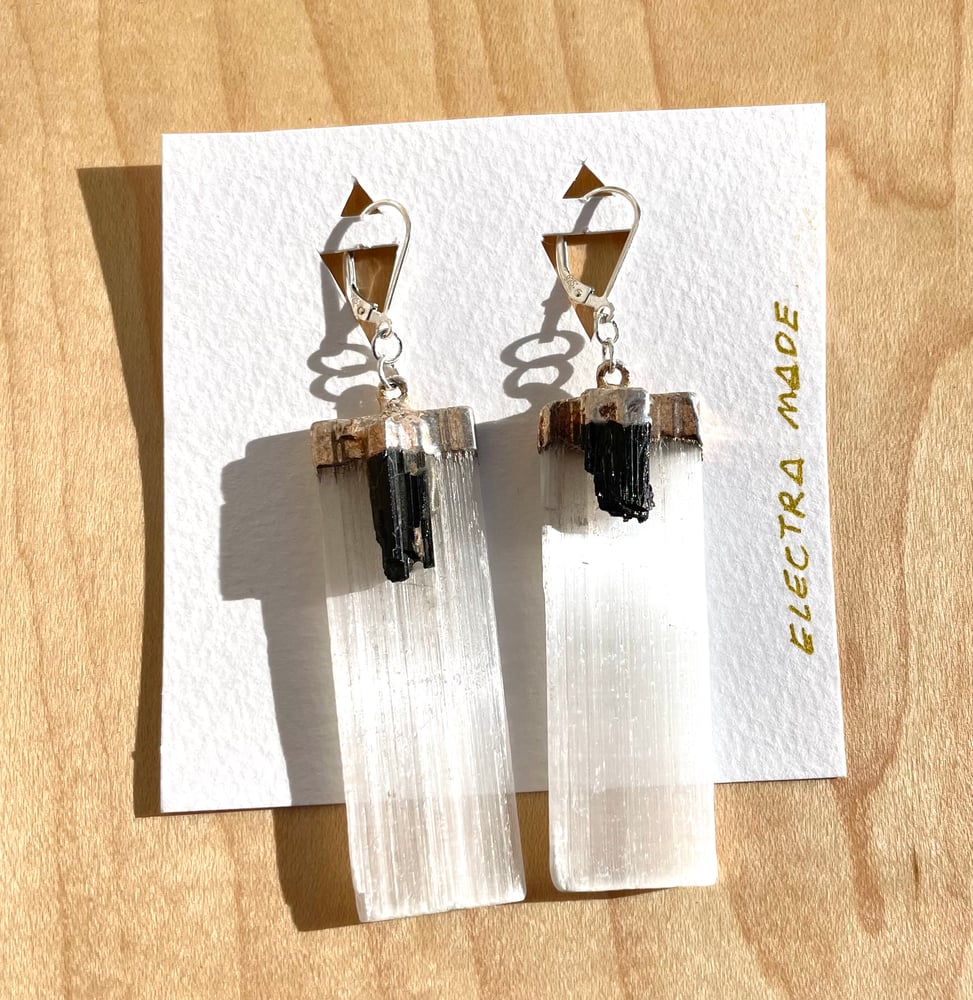 Selenite with Black Tourmaline accents and Sterling Silver hooks.